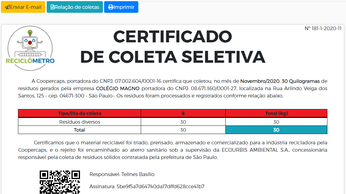 - Certificados e Termos de Responsabilidade de Coleta para geradores